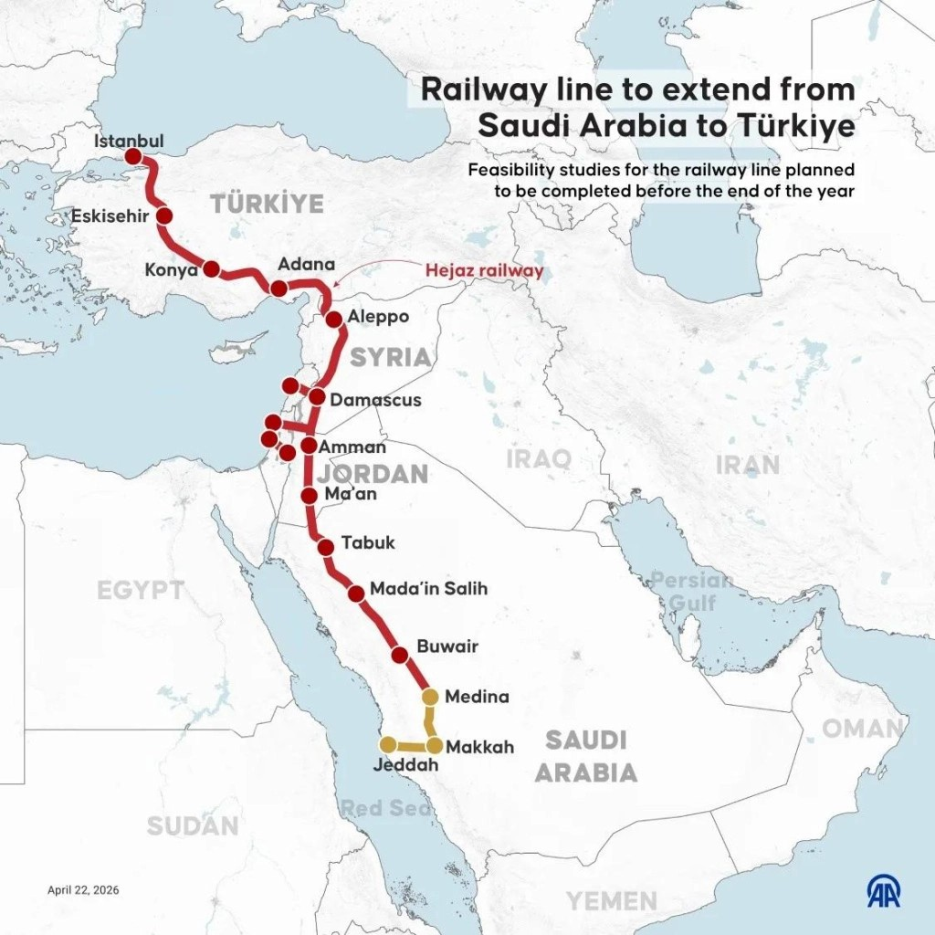 Arab Saudi dan Turki tengah mematangkan rencana pembangunan jalur kereta lintas negara yang akan menghubungkan Jeddah hingga Istanbul melalui kota-kota suci. Proyek ini masih dalam tahap studi kelayakan yang ditargetkan rampung pada akhir 2026.